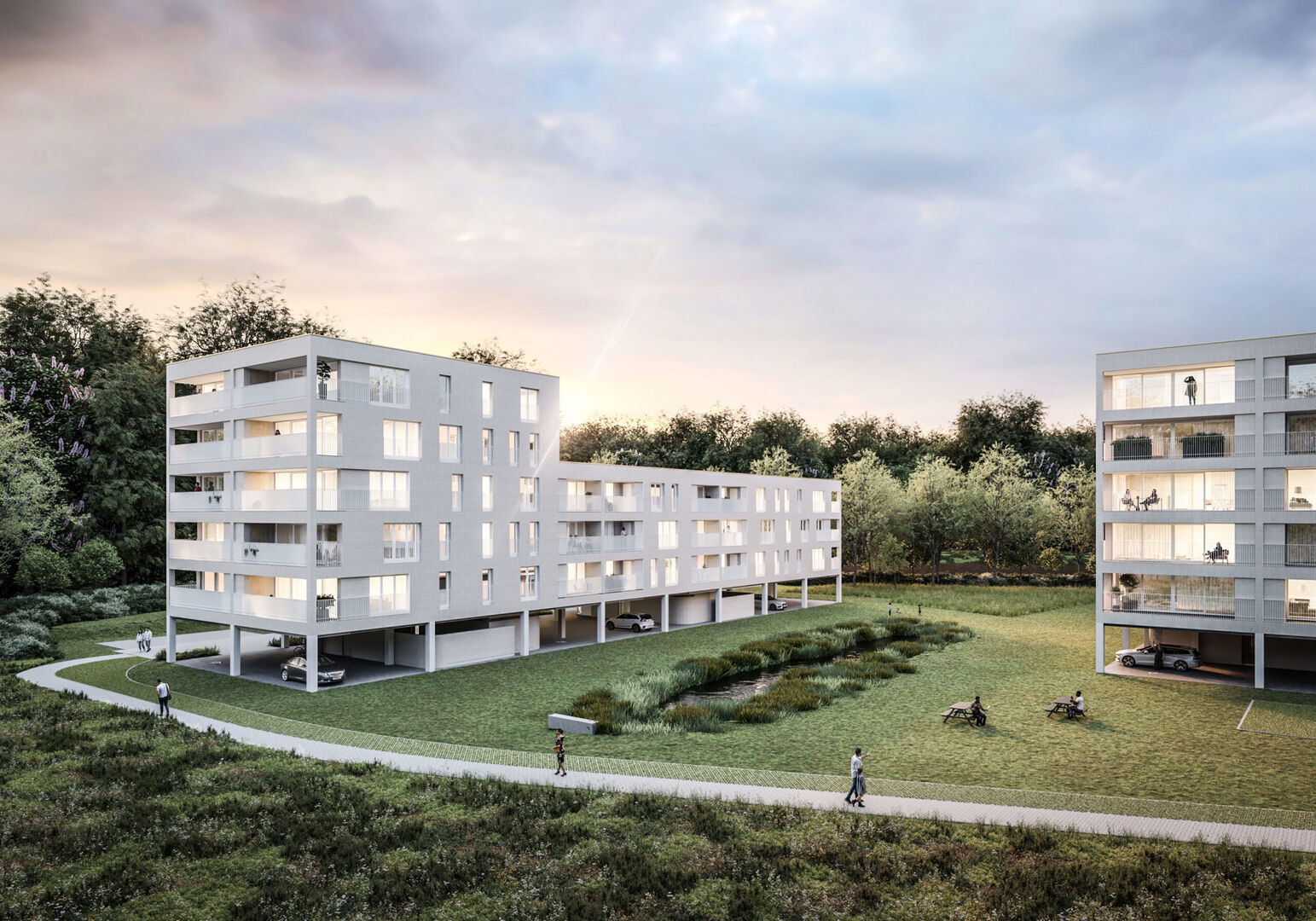 De ligging is werkelijk een grote troef: de residentie bevindt zich in een prachtige, groene omgeving en wordt omgeven door water, wat zorgt voor een unieke, rustige woonbeleving met een open en ruimtelijk gevoel.