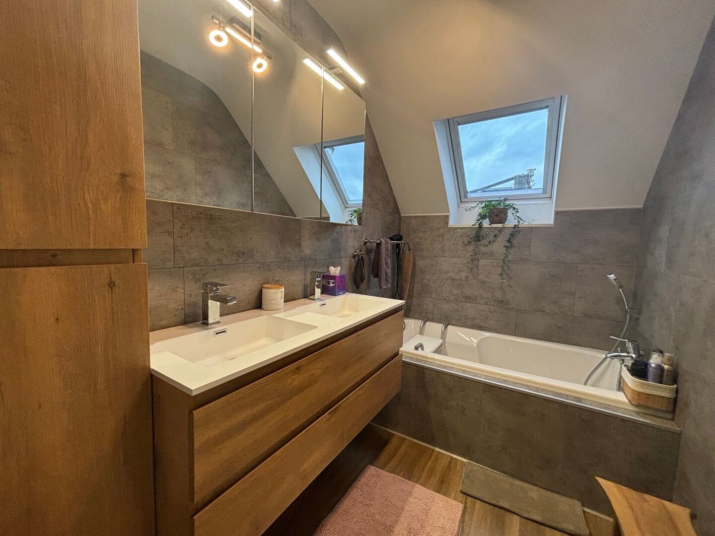 Op de bovenverdieping is er een badkamer aanwezig (dubbele lavabo en bad) alsook twee slaapkamers.