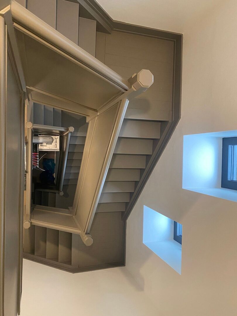 We betreden het appartement op het gelijkvloers. Hier is onmiddellijk een trap naar boven.