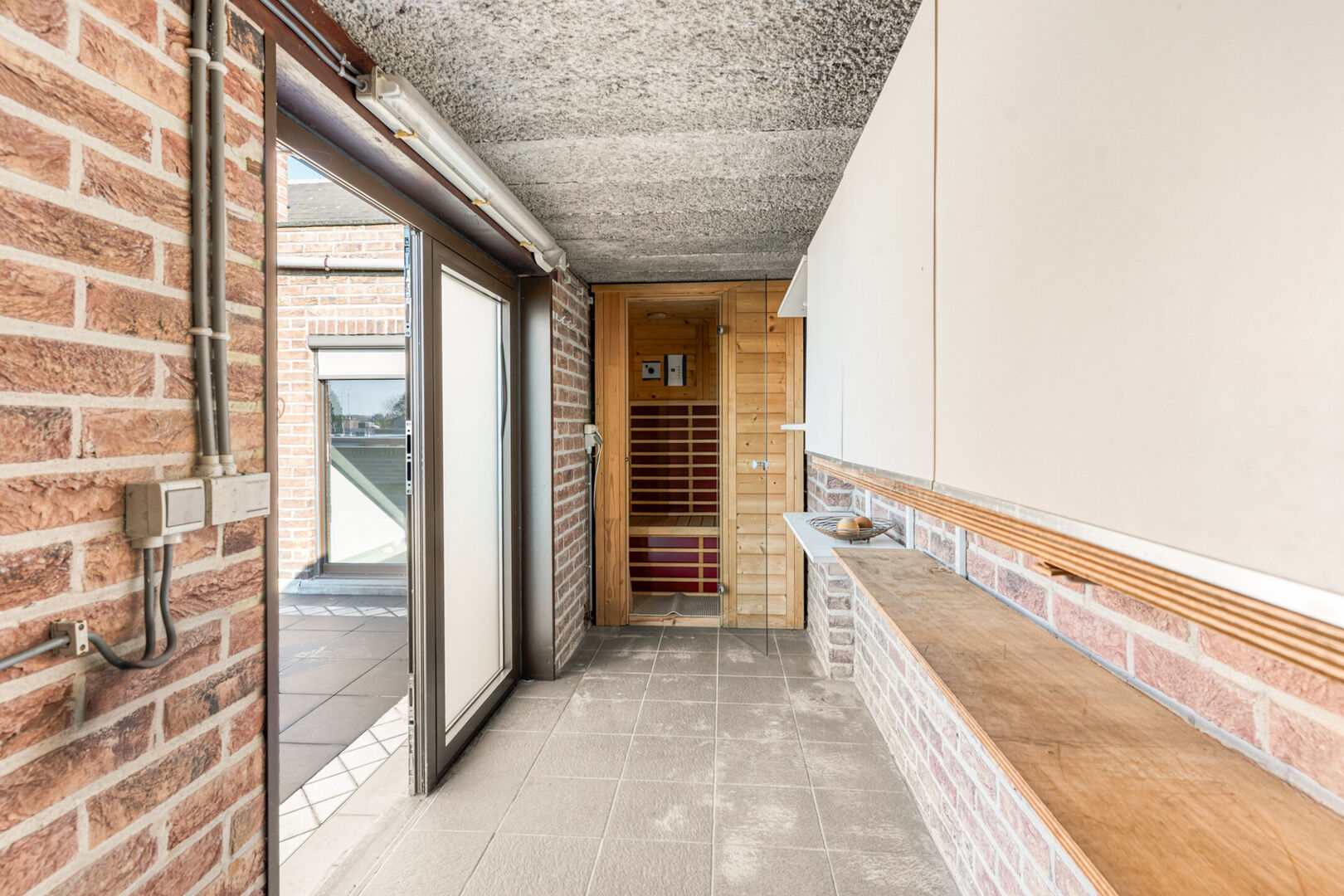 In een appartementsgebouw, gelegen aan de Steenweg op Mol nr 6, op wandelafstand van de Grote Markt van Turnhout, betreden we via de glazen voordeur, de gang en nemen we de lift naar de bovenste verdieping. De entree van het appartement heeft een gastentoilet en vestiairehoek, met daarnaast een kleine technische berging. We lopen meteen door naar de ruime woonkamer op parket. Goede lichtinval is verzekerd door een raam voorin, en de grote schuifraam achteraan die uitgeeft het zeer ruime terras wat zicht biedt op een groot deel van de stad. Bij het terras hoort een gesloten berging waarin een infrarood saunacabine staat.