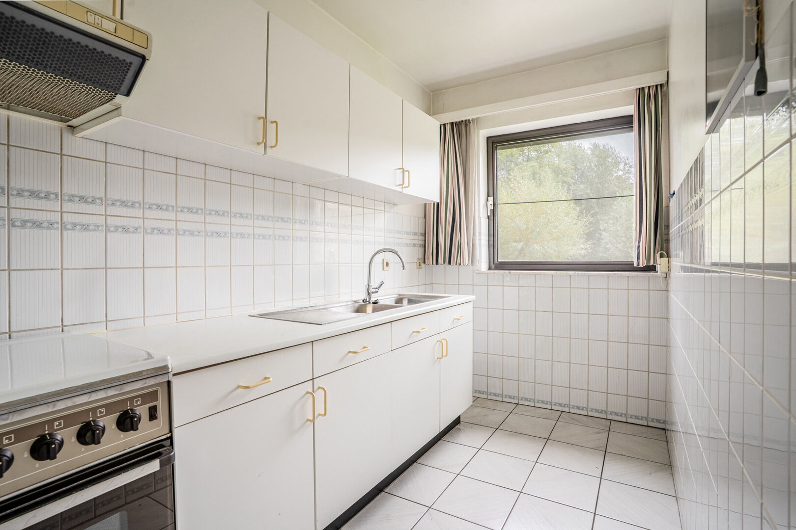 Ingerichte keuken met fornuis en dampkap