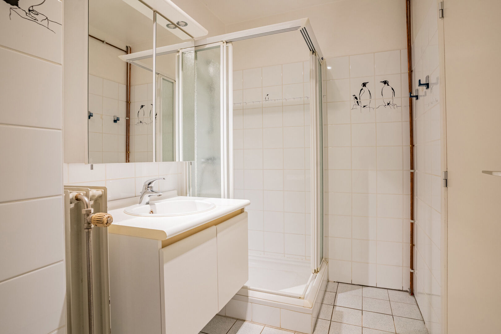 Badkamer met douche en lavabo in een meubel