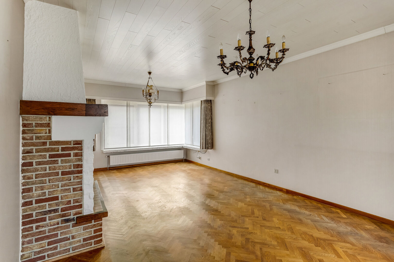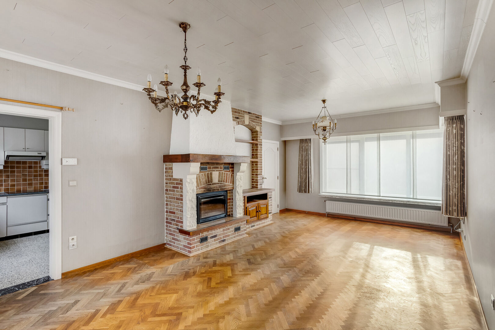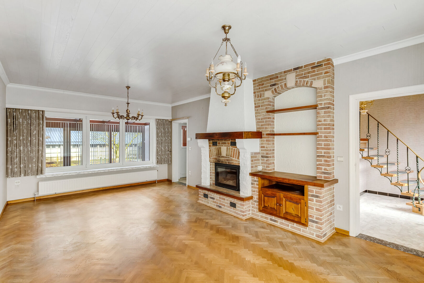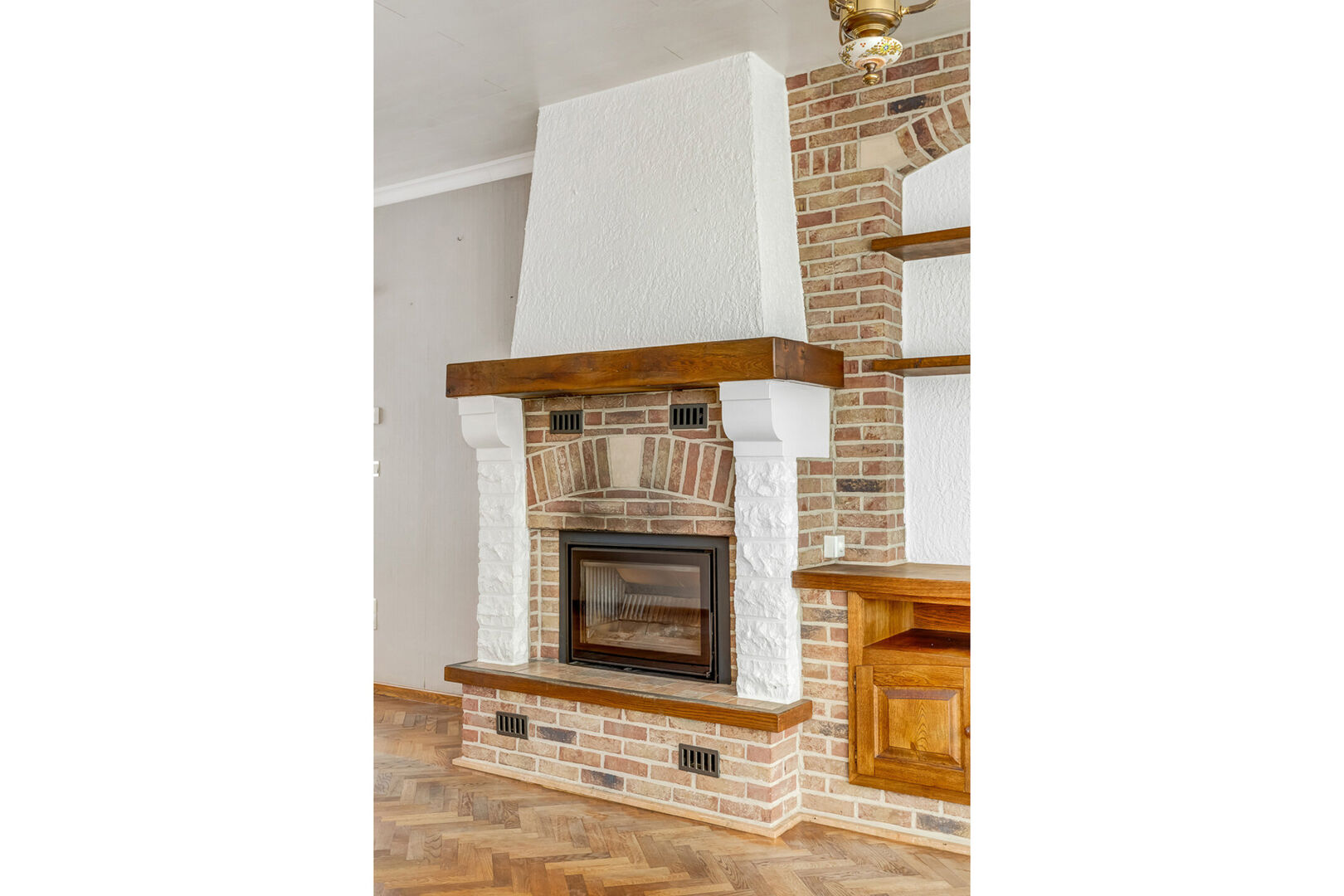 Via de inkomhal betreden we de woning om dan naar de ruime woonkamer te gaan met een visgraatparket en openhaard.