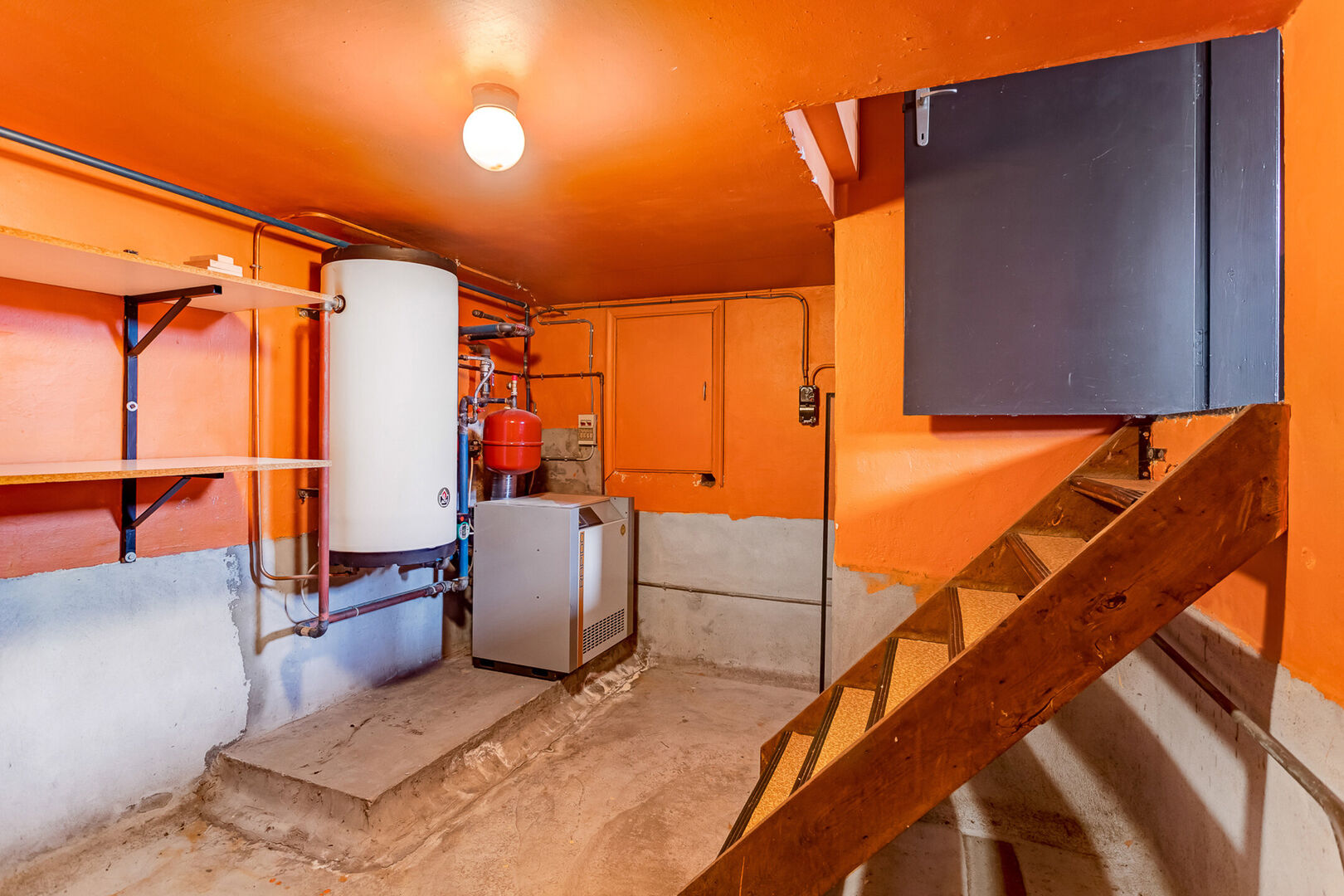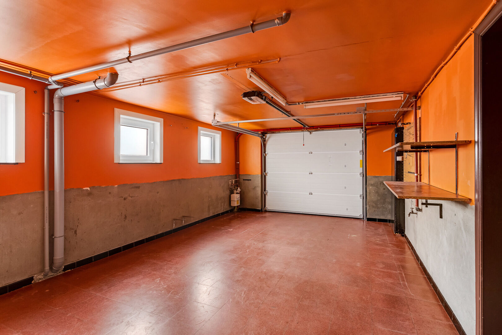Dan komen we in de ruime garage terecht met een automatische poort. Via een trap komen we in de kelder terecht waar zich de gas cv bevindt en de boiler.