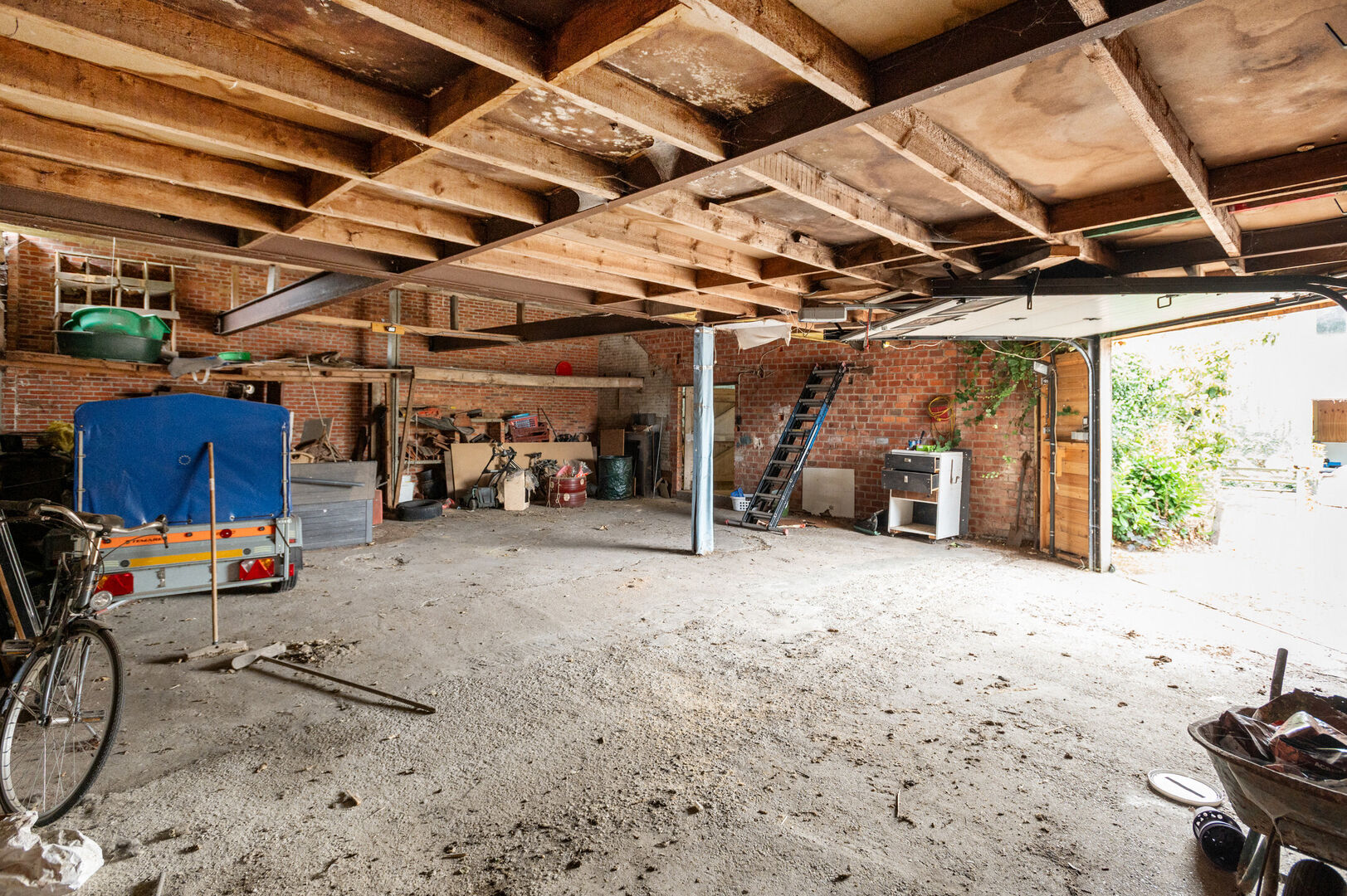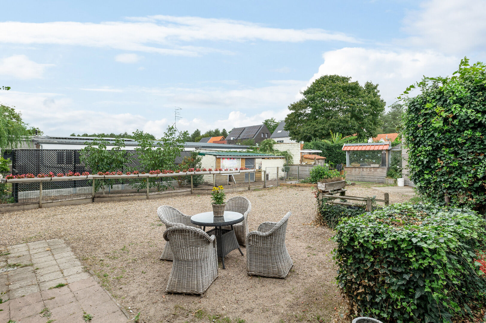 Via de veranda achteraan de woning komen we in de tuin, met toegang tot een ruime overdekte garage.