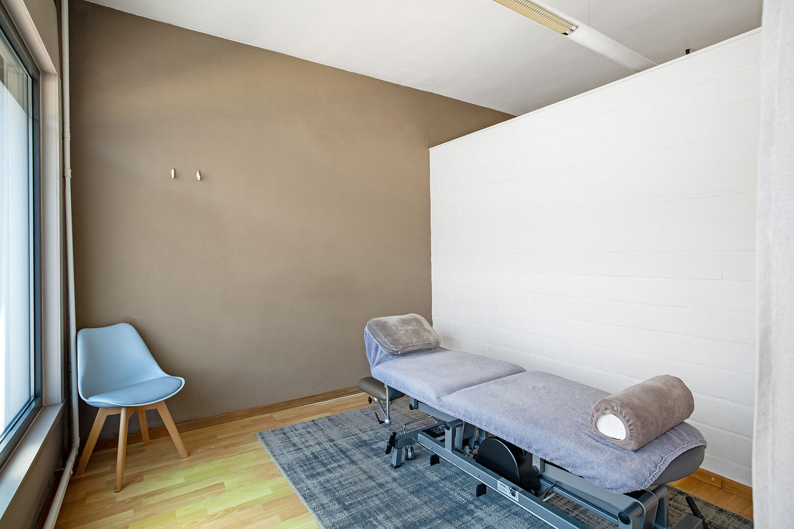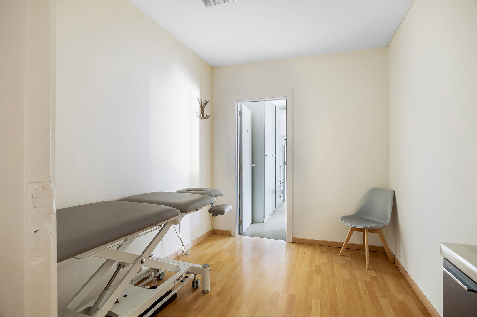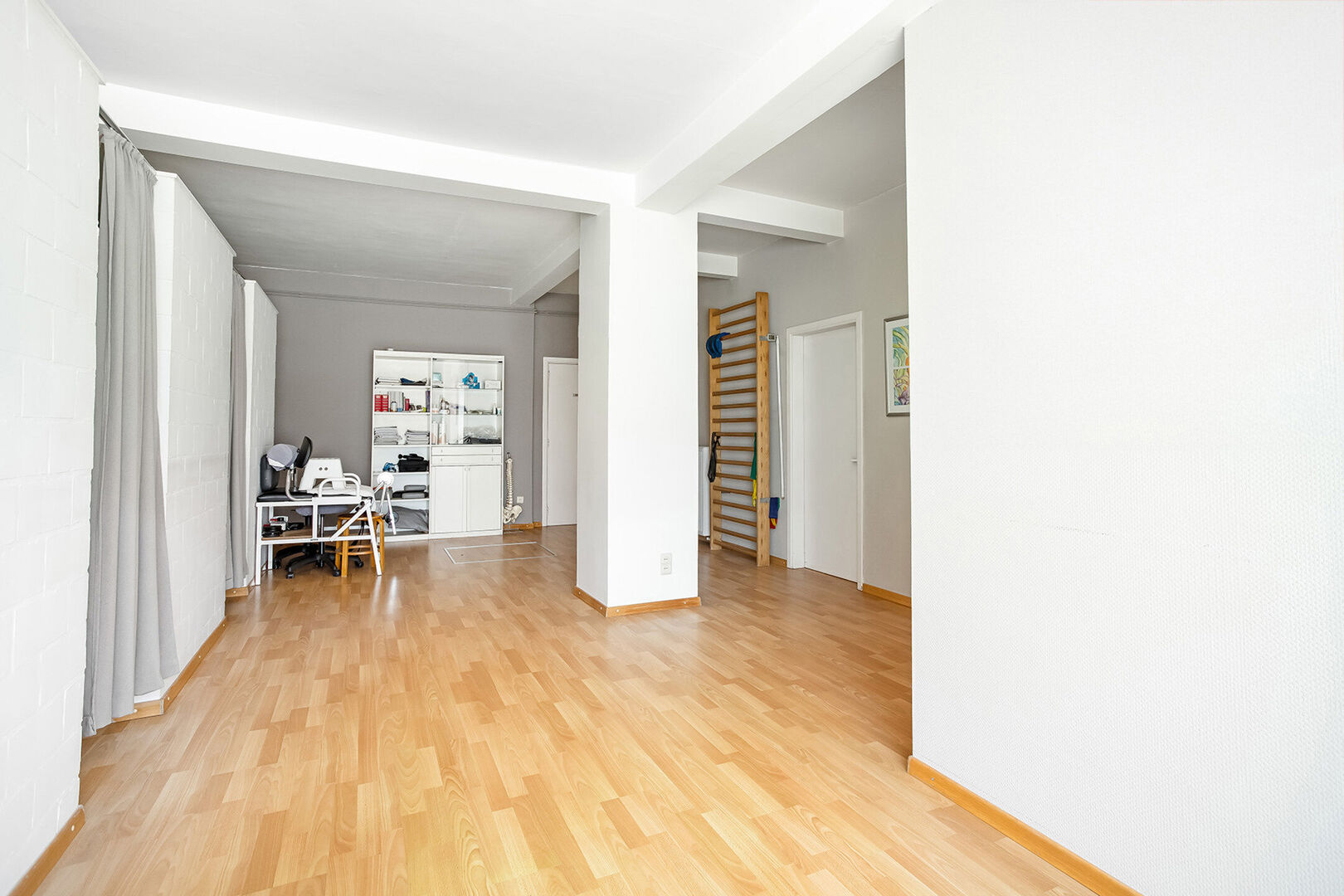 Vooraan betreden we de praktijk met als eerste een ontvangst-/wachtruimte, bureel/berging en afzonderlijk toilet. Vervolgens hebben we een ruime polyvalente ruimte die momenteel beschikt over 4 afzonderlijke behandelruimtes.