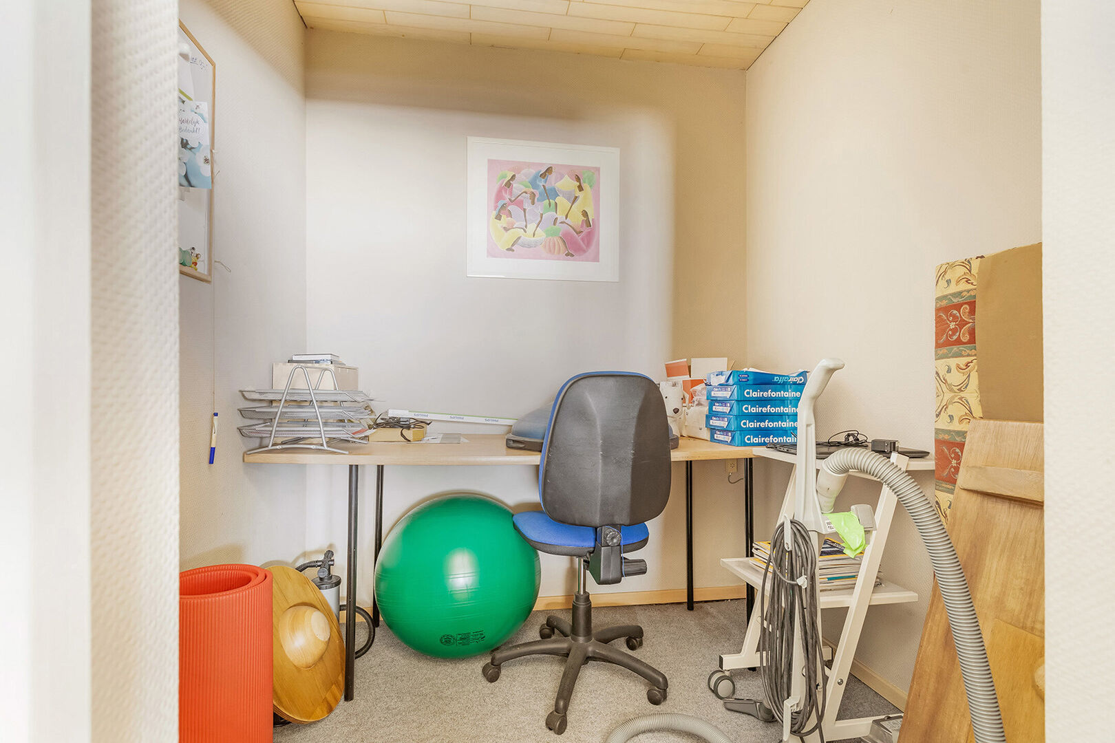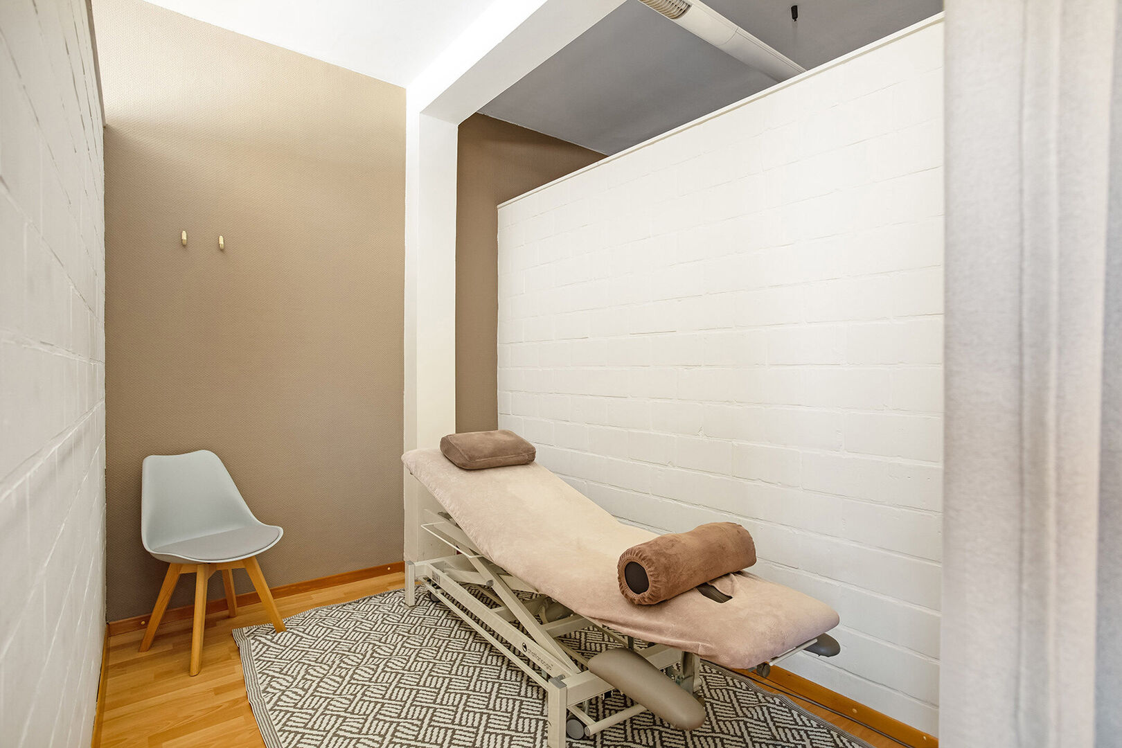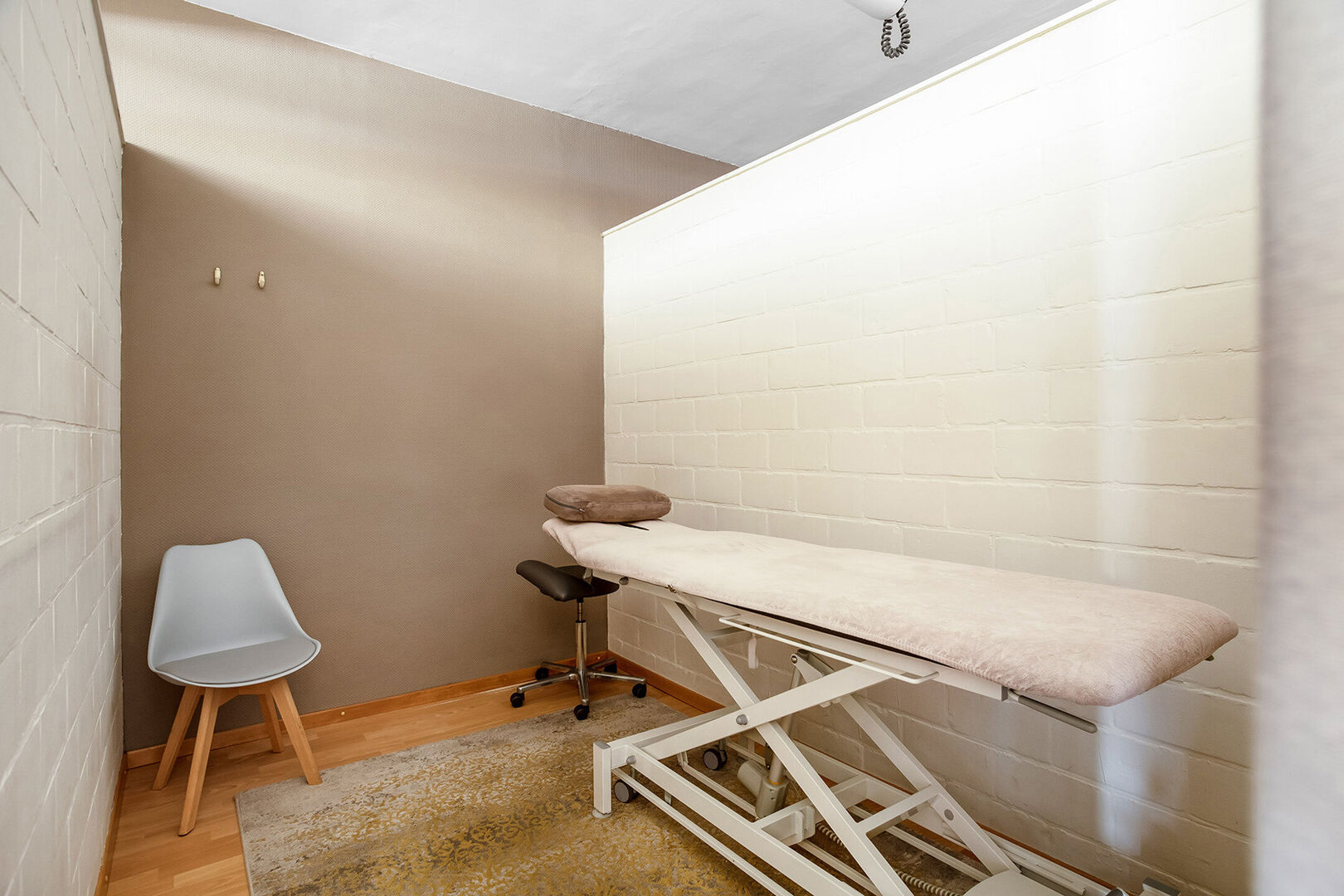 Vooraan betreden we de praktijk met als eerste een ontvangst-/wachtruimte, bureel/berging en afzonderlijk toilet. Vervolgens hebben we een ruime polyvalente ruimte die momenteel beschikt over 4 afzonderlijke behandelruimtes.