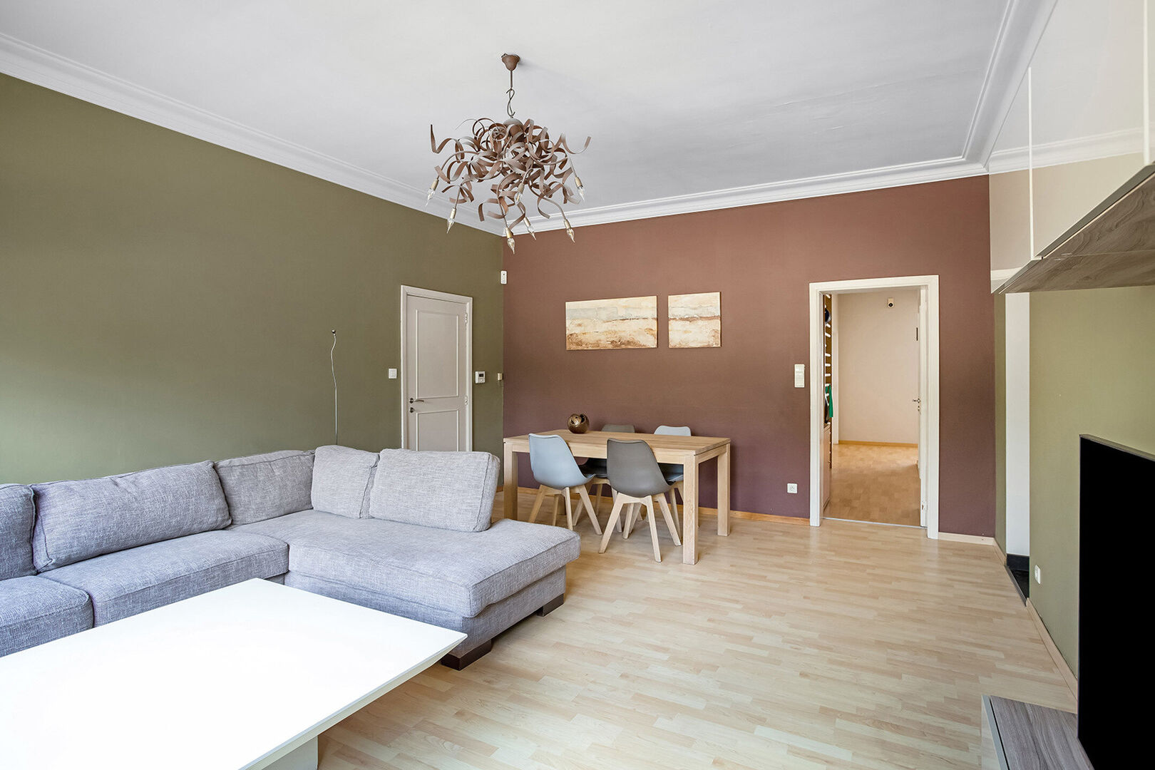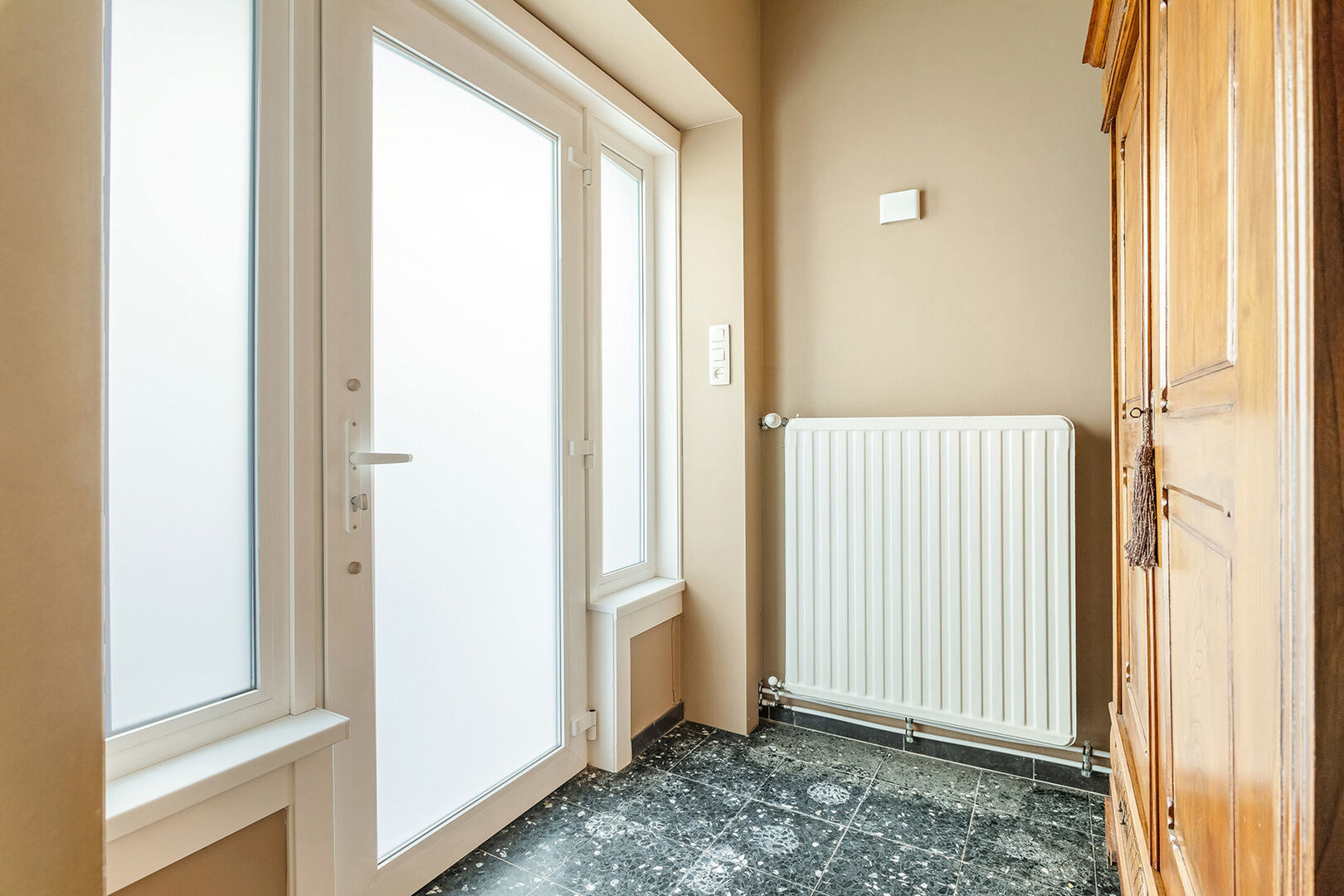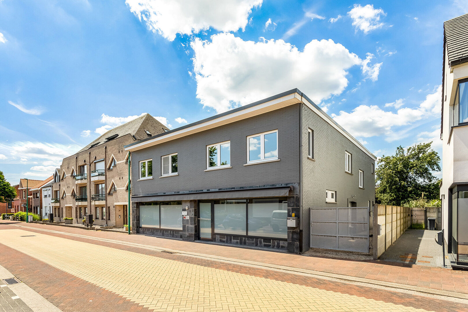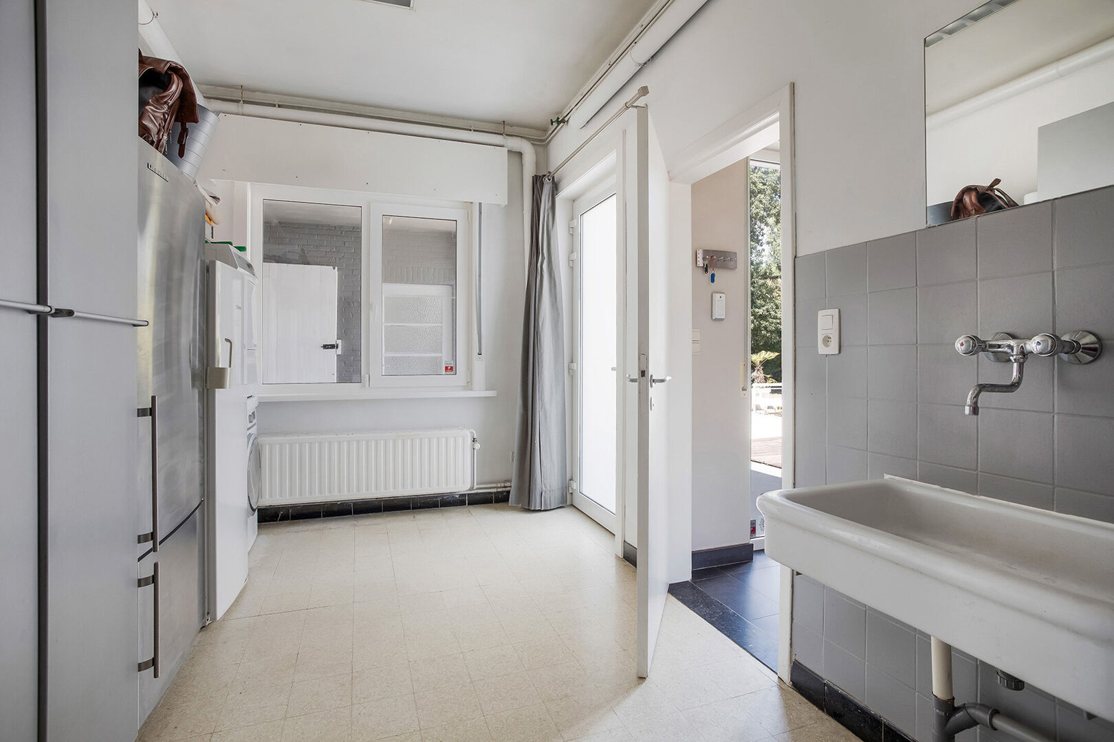 Aansluitend aan de praktijk bevinden we ons in de woning dewelke eveneens toegankelijk is via een afzonderlijke inkomhal met gastentoilet en toegang tot de kelder. De woning beschikt op het gelijkvloers verder over een leefruimte, een ruime geïnstalleerde keuken en een wasplaats.