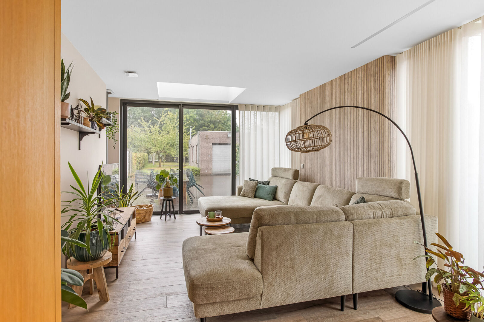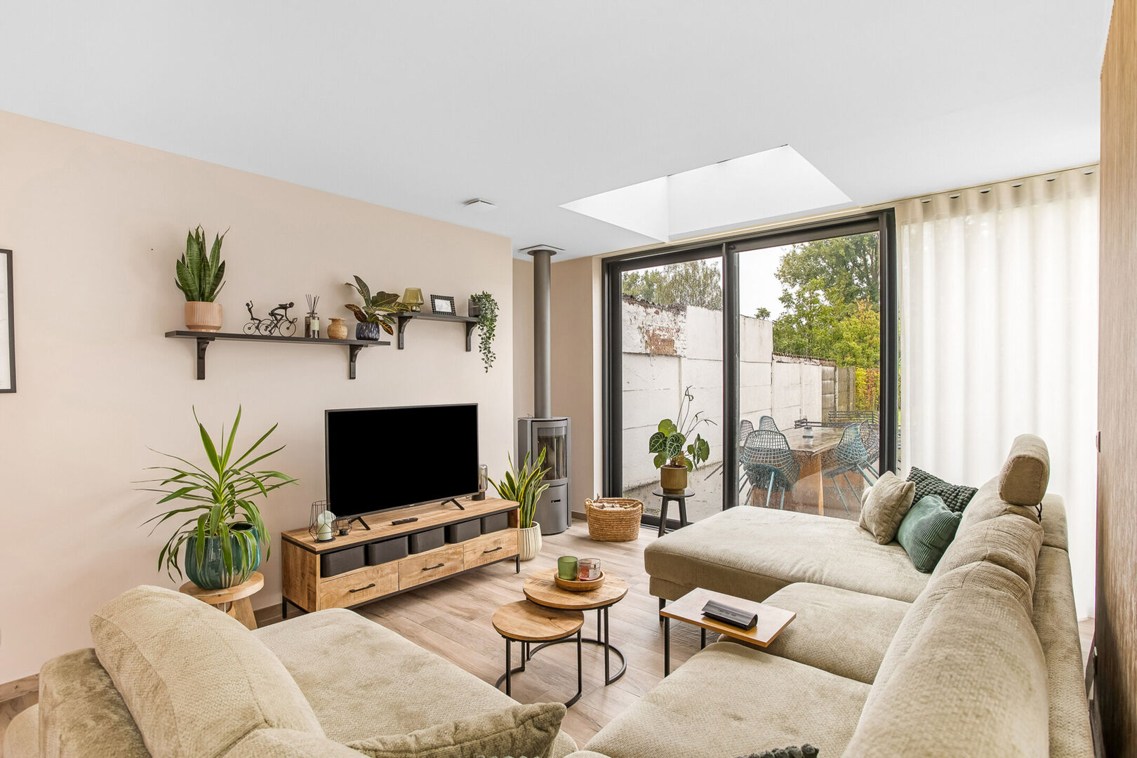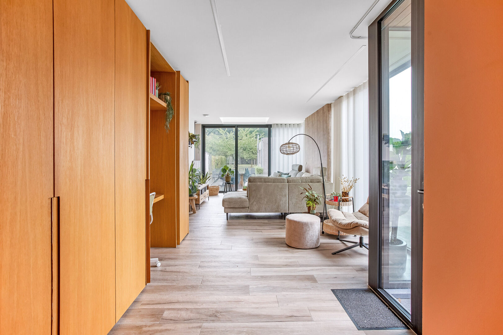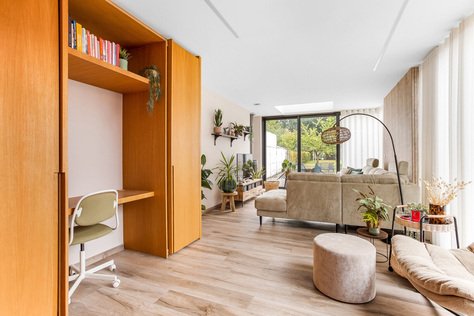Je komt binnen via een inkomhal met gastentoilet, waarna je de leefruimte betreedt met een eethoek en een open keuken voorzien van alle comfort en inbouwkasten. Aansluitend bevindt zich de zithoek, met veel lichtinval en zicht op de tuin.