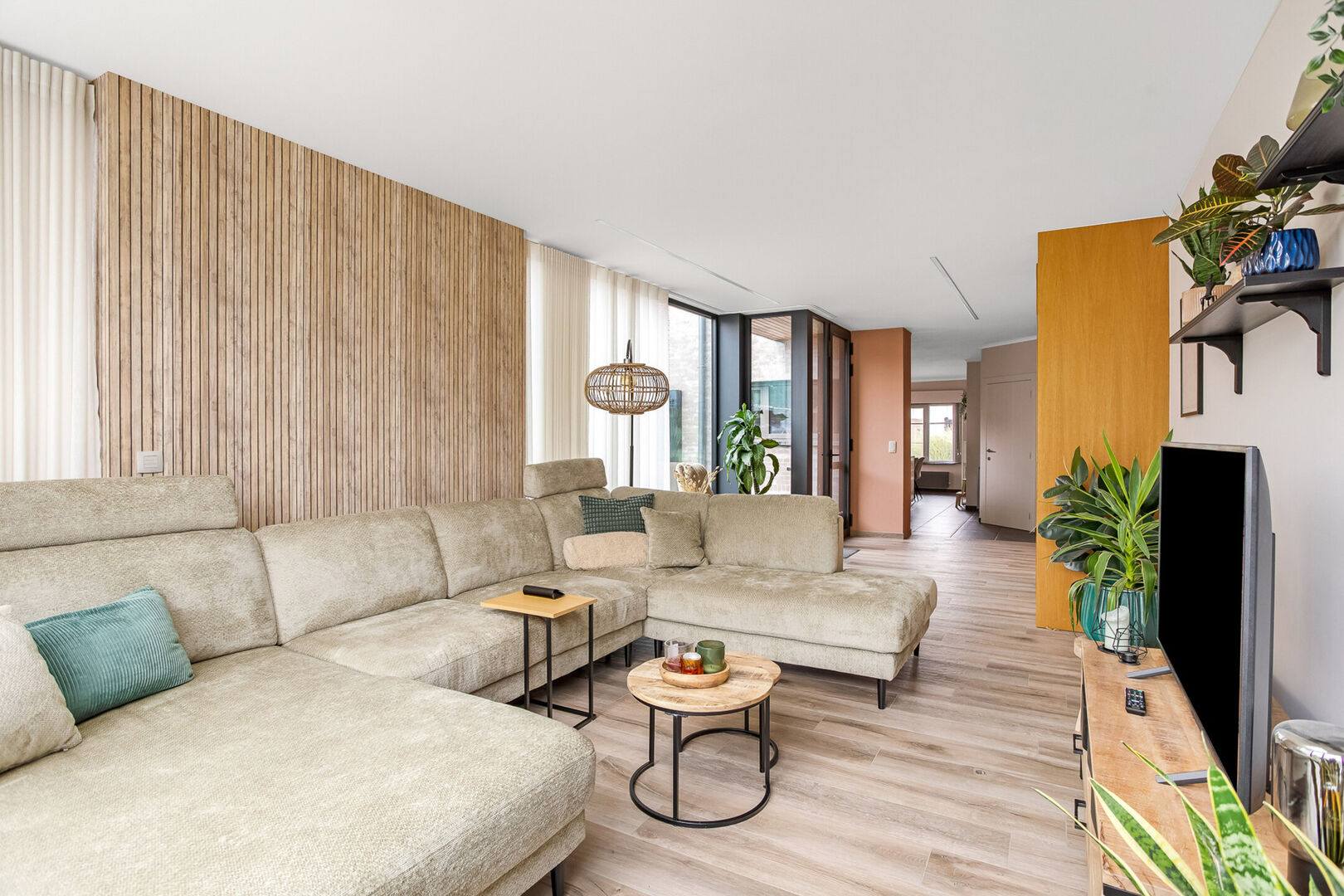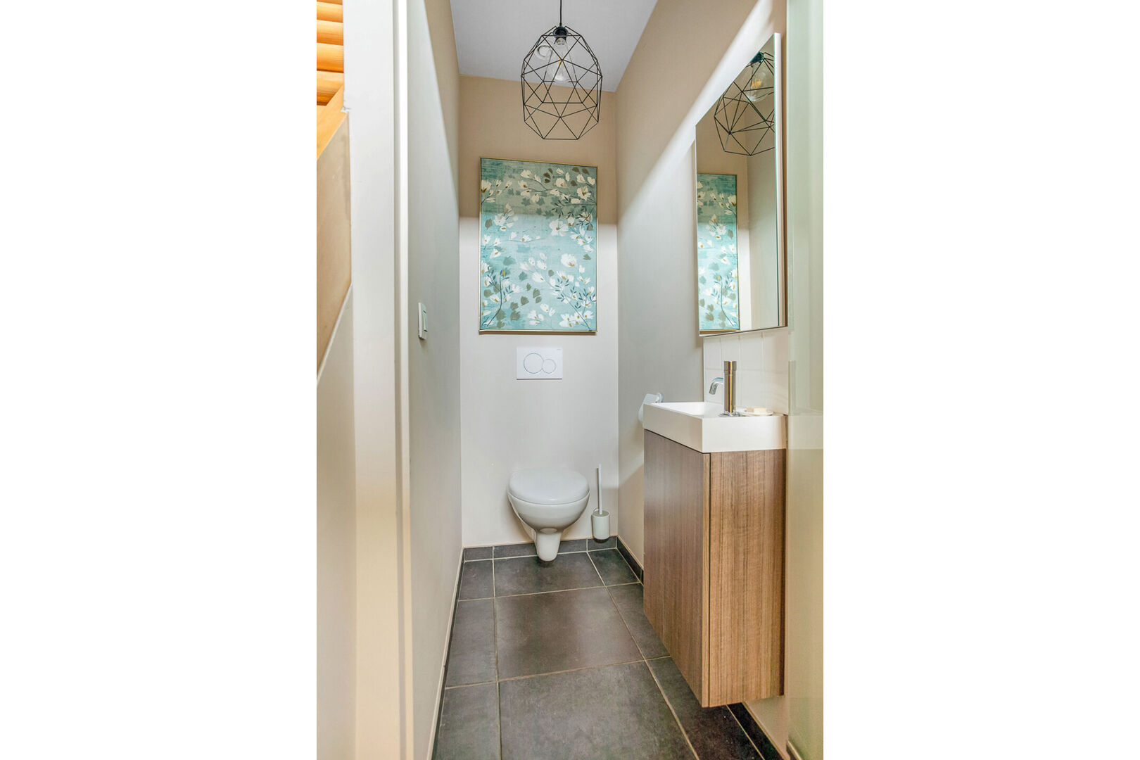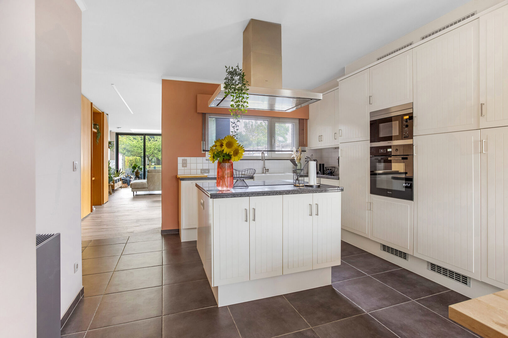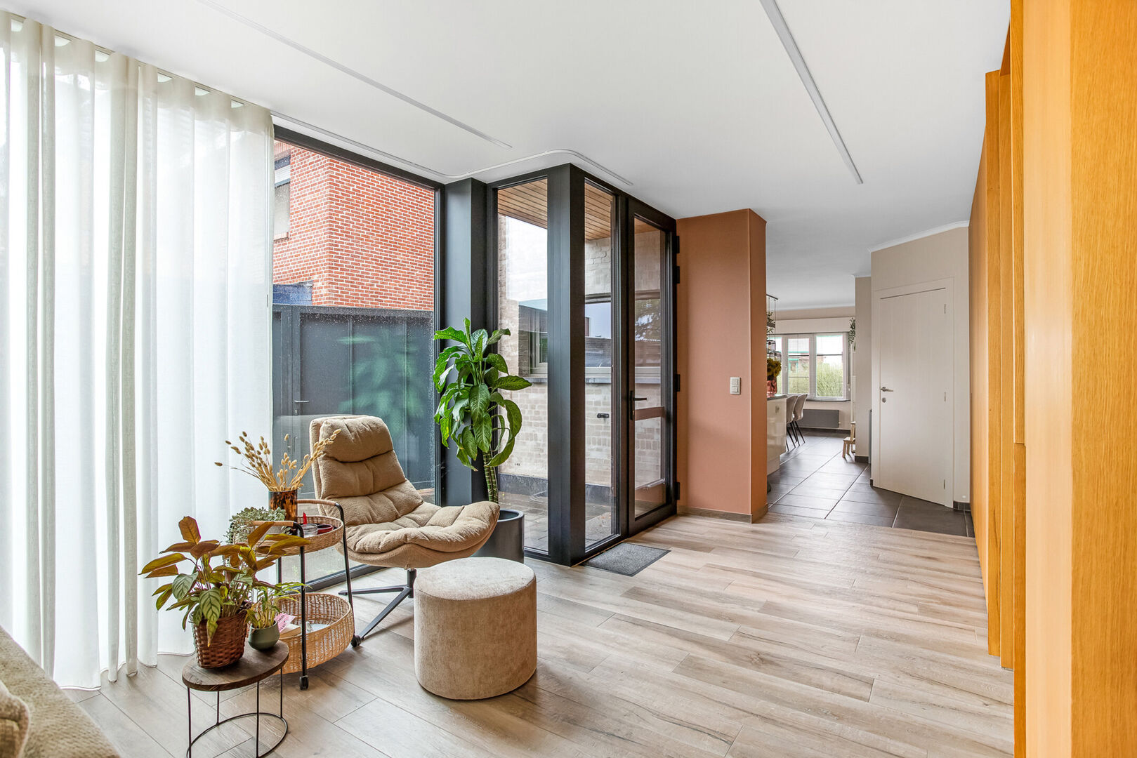 Je komt binnen via een inkomhal met gastentoilet, waarna je de leefruimte betreedt met een eethoek en een open keuken voorzien van alle comfort en inbouwkasten. Aansluitend bevindt zich de zithoek, met veel lichtinval en zicht op de tuin.