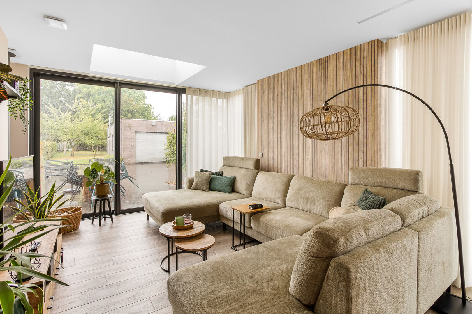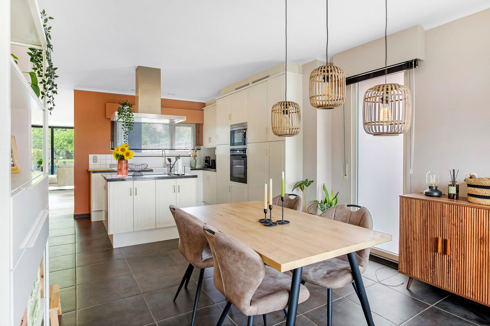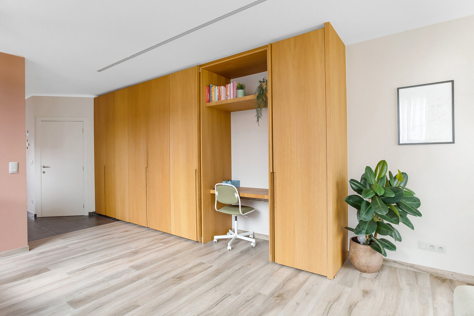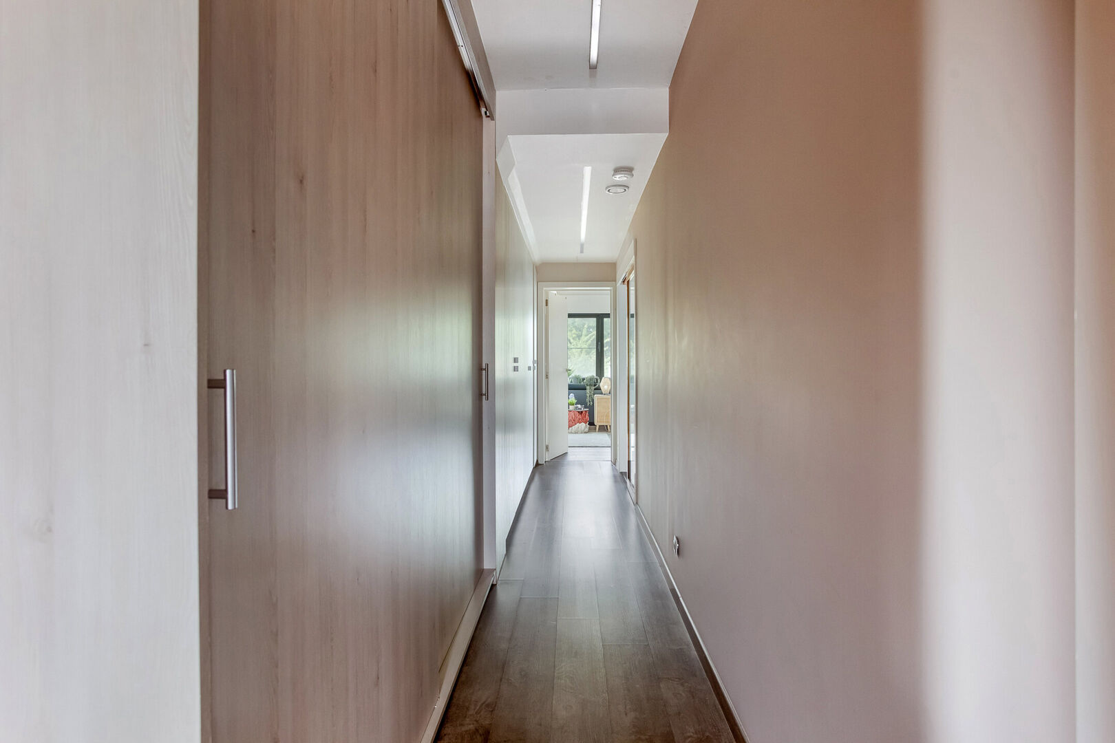 Je komt binnen via een inkomhal met gastentoilet, waarna je de leefruimte betreedt met een eethoek en een open keuken voorzien van alle comfort en inbouwkasten. Aansluitend bevindt zich de zithoek, met veel lichtinval en zicht op de tuin.