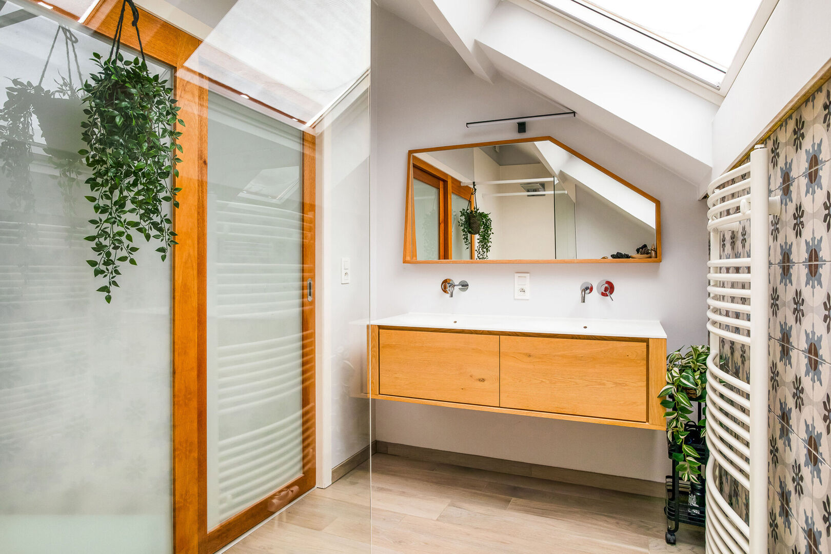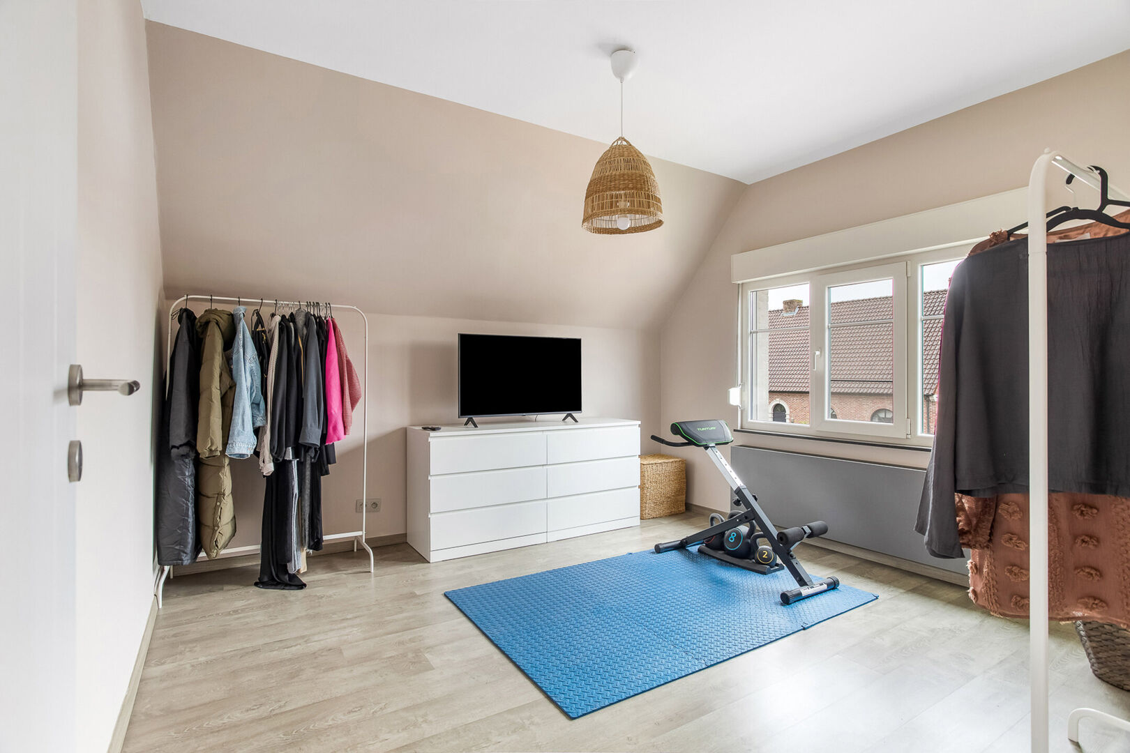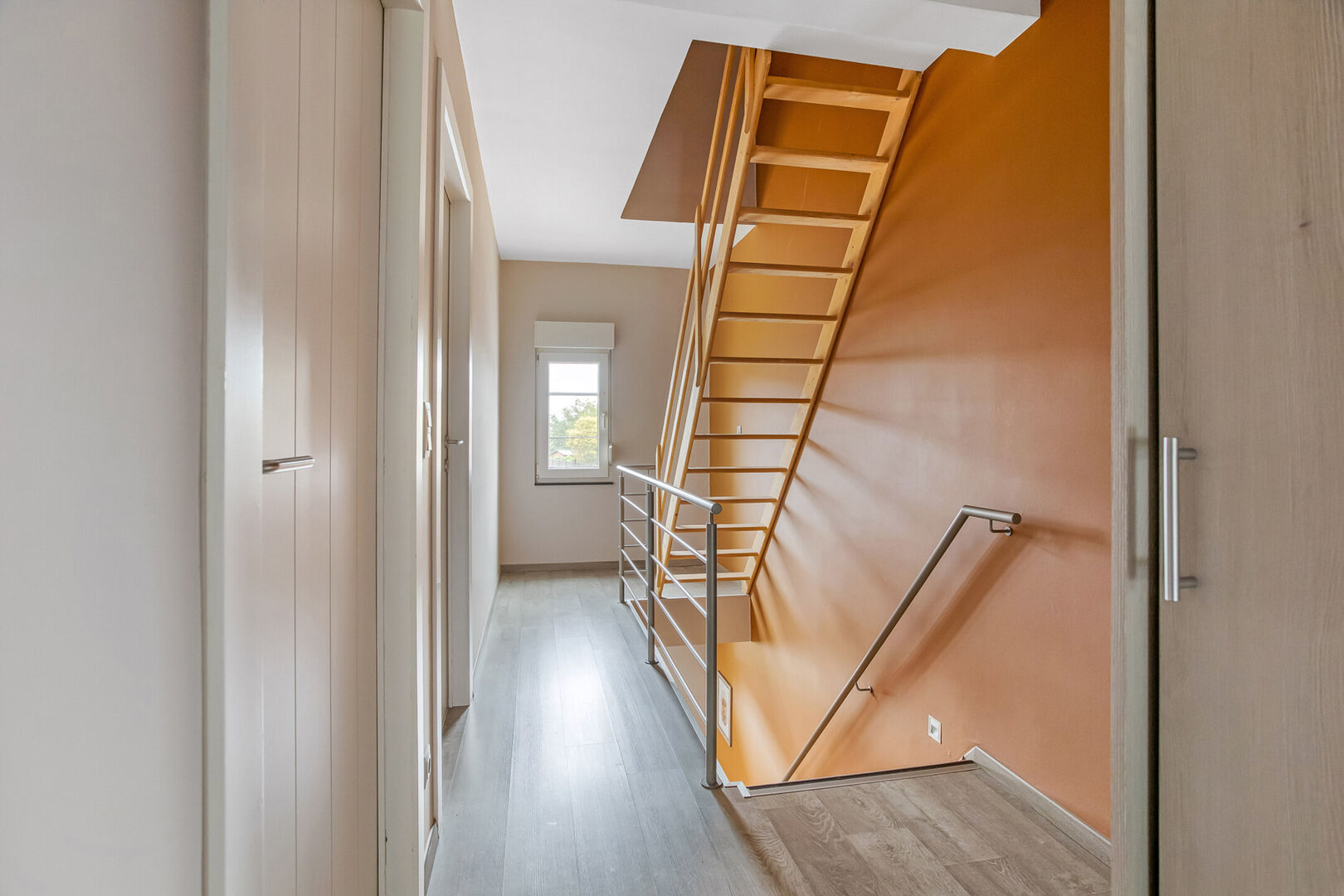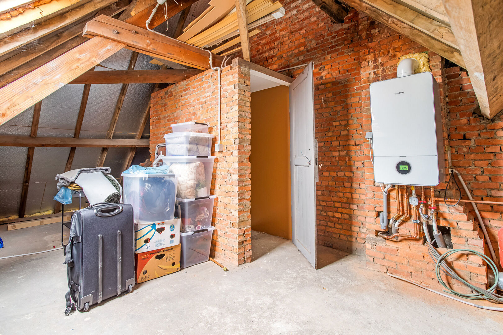 Op de eerste verdieping vind je drie slaapkamers en een moderne badkamer met inloopdouche, dubbele lavabo en handdoekverwarming. Via een vaste trap bereik je de opbergzolder, waar in 2023 een nieuwe condensatieketel werd geplaatst.