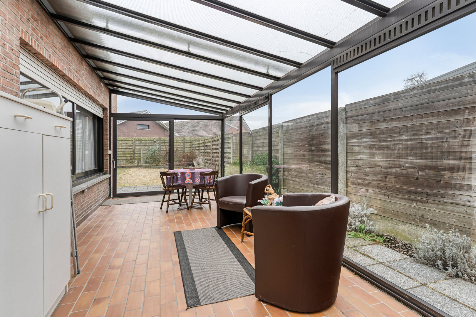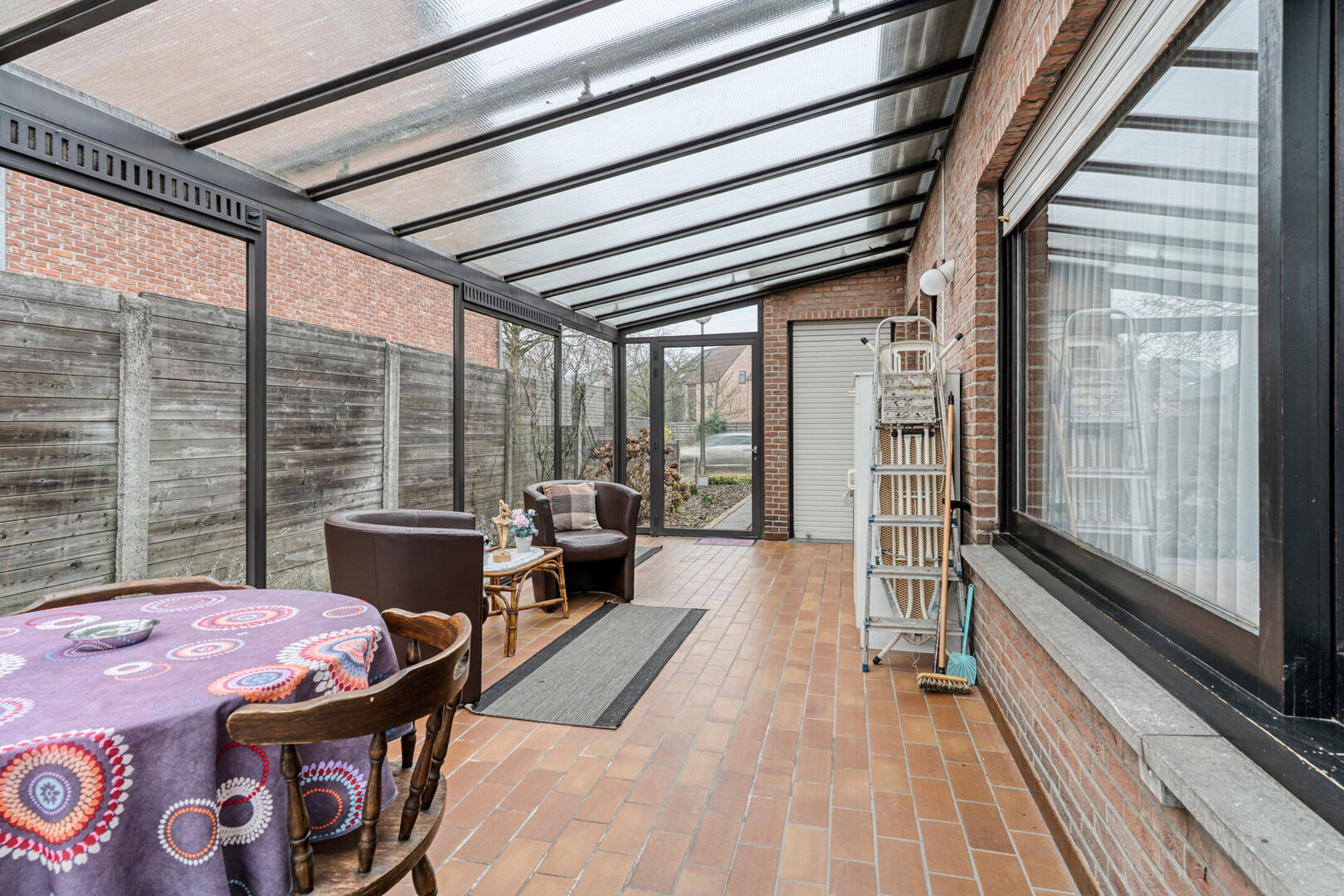 We betreden de woning via de inkomhal die toegang geeft tot de leefruimte. Deze voelt bijzonder lichtrijk aan, dankzij de grote raampartijen stroomt het daglicht rijkelijk binnen, wat bijdraagt aan het open karakter van de woning. Aansluitend vinden we de keuken is er toegang tot de verandapartij.