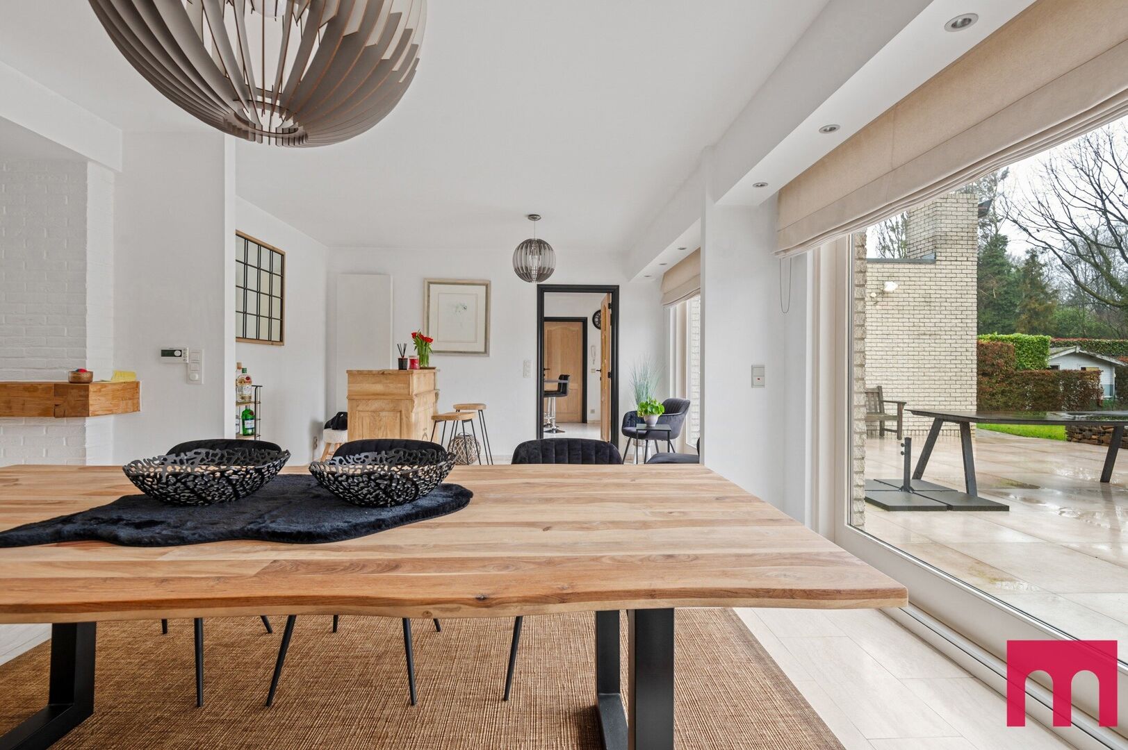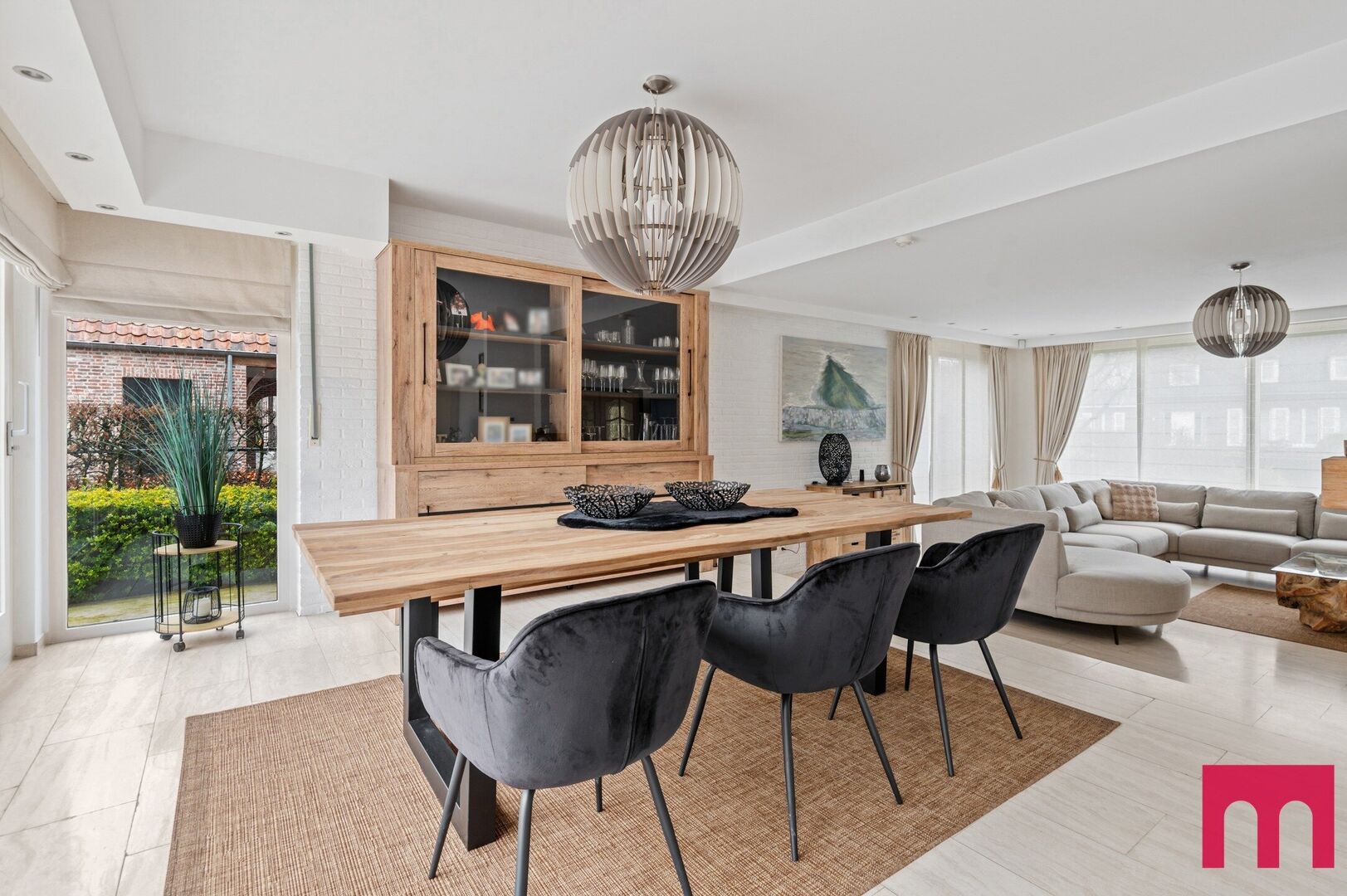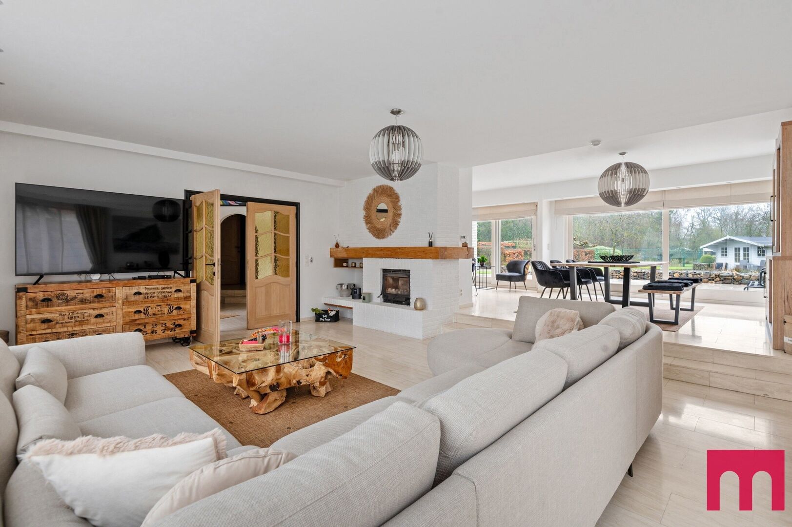 Via dubbele deuren stap je de woonkamer binnen. De grandeur loopt hier moeiteloos verder. Dankzij de grote raampartijen geniet je van uitzonderlijk veel licht en een panoramisch zicht op de tuin.